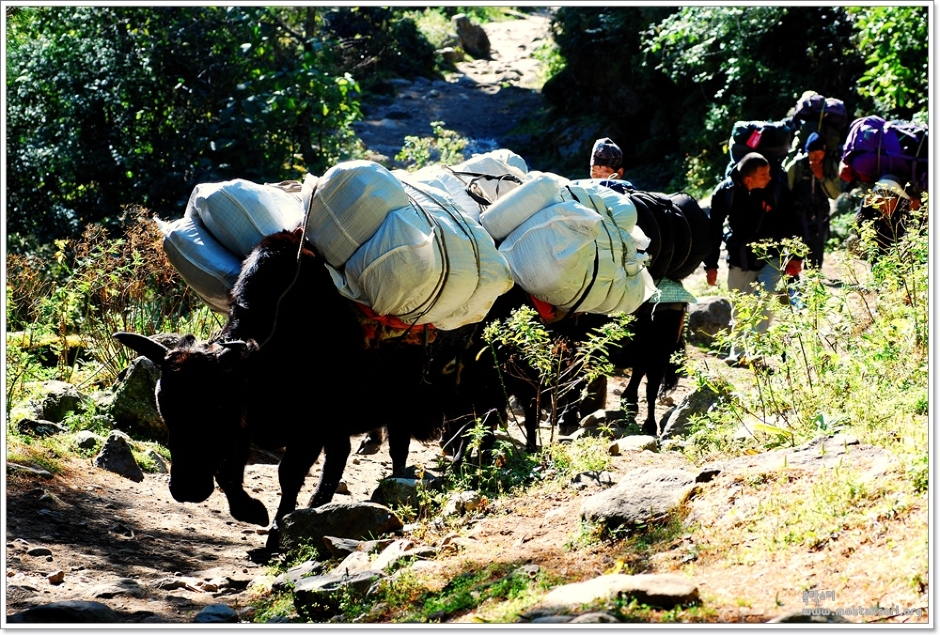 짐을 잔뜩 등에 인 채 출발 준비에 한창이다.