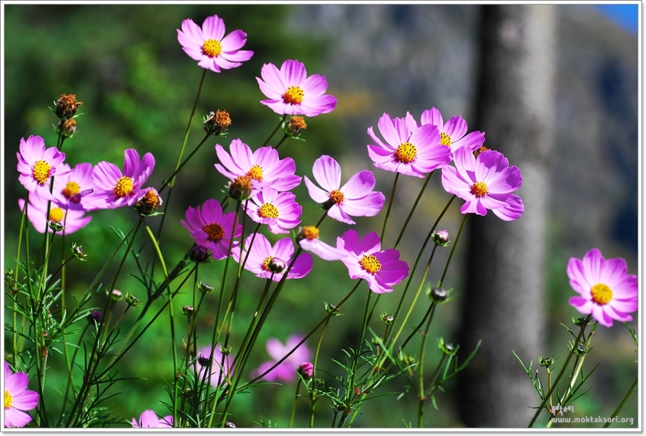 그리고 코스모스는 파아란 하늘을 배경으로 옆 집 담장 곁을 하늘거리며 서 있다.