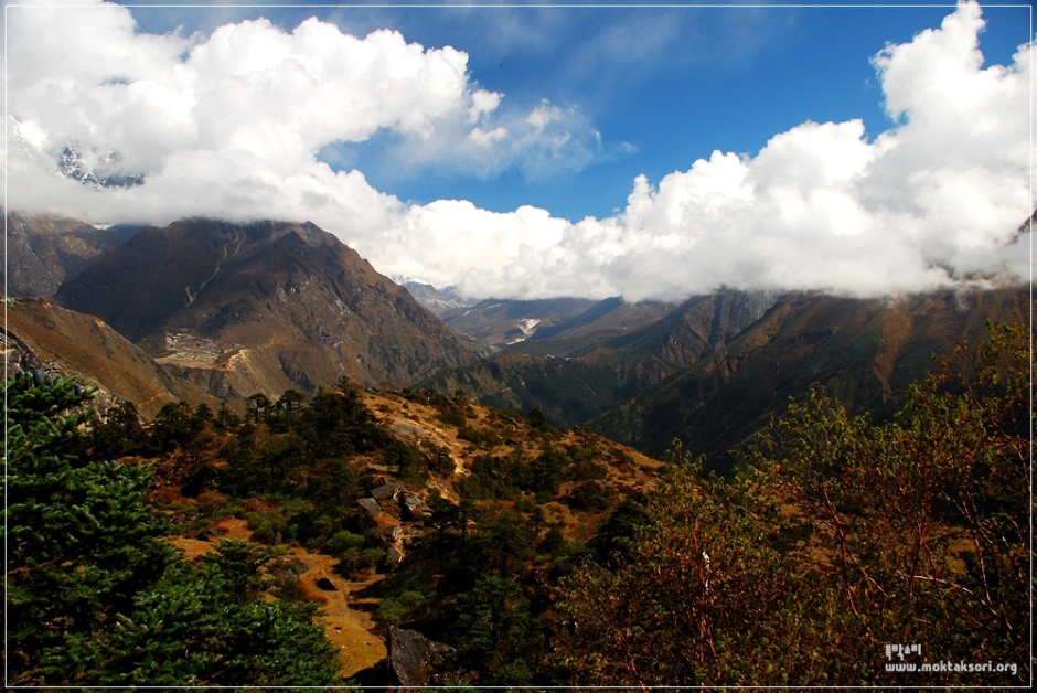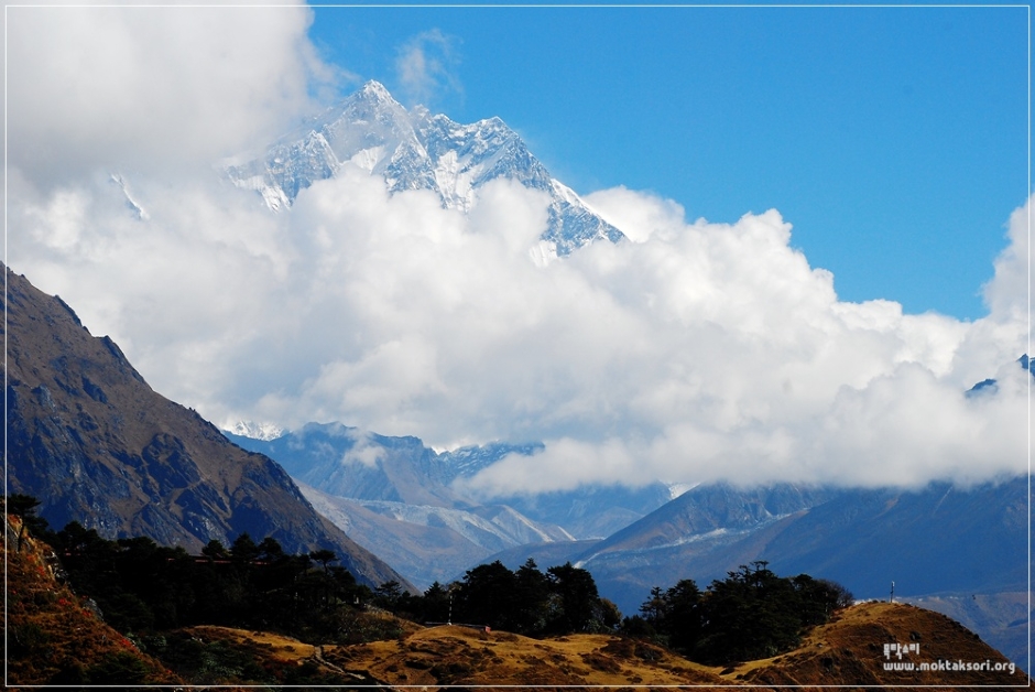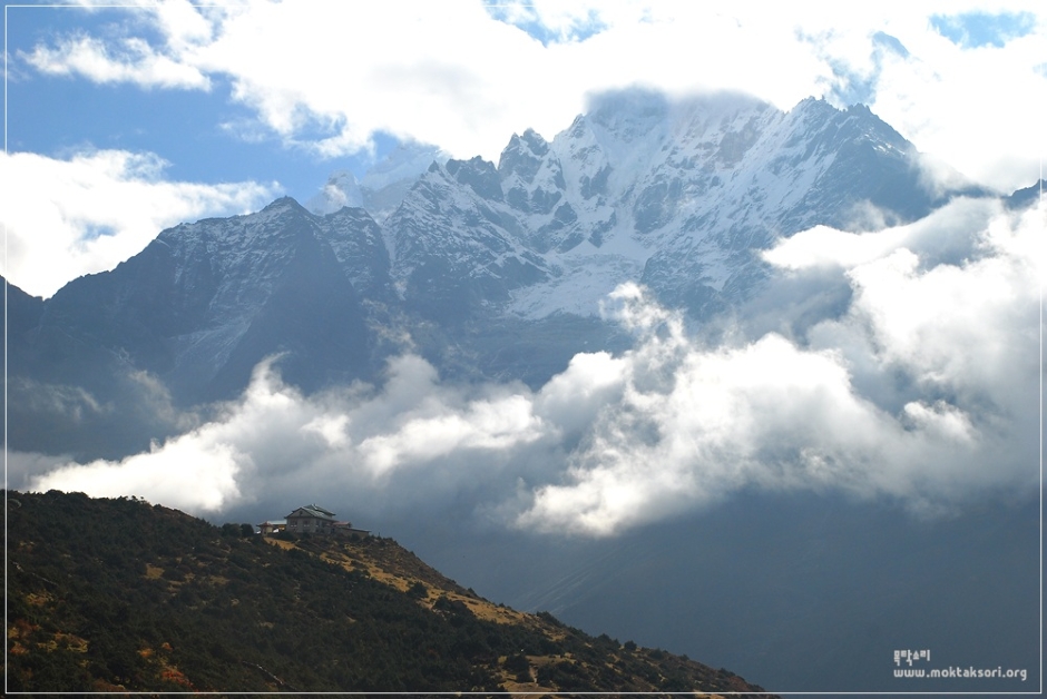 그 건너편 위로 솟아오른 구름에 반쯤 가려진 탐세르쿠와 캉테가 만년설산,