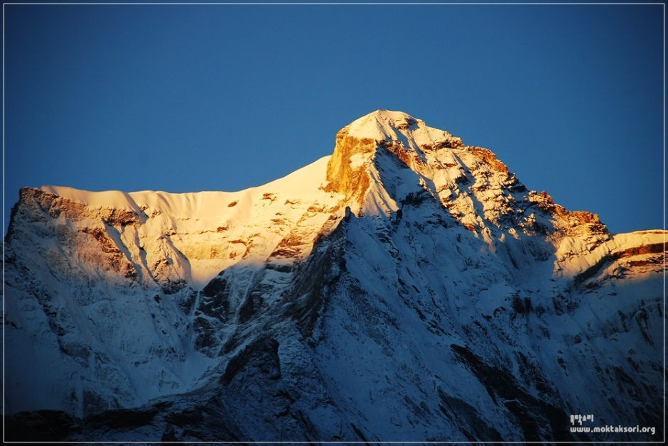 콩대(Kornde, 6187m)의 만년설 봉우리 위로 황금빛 일출이 시작된다.